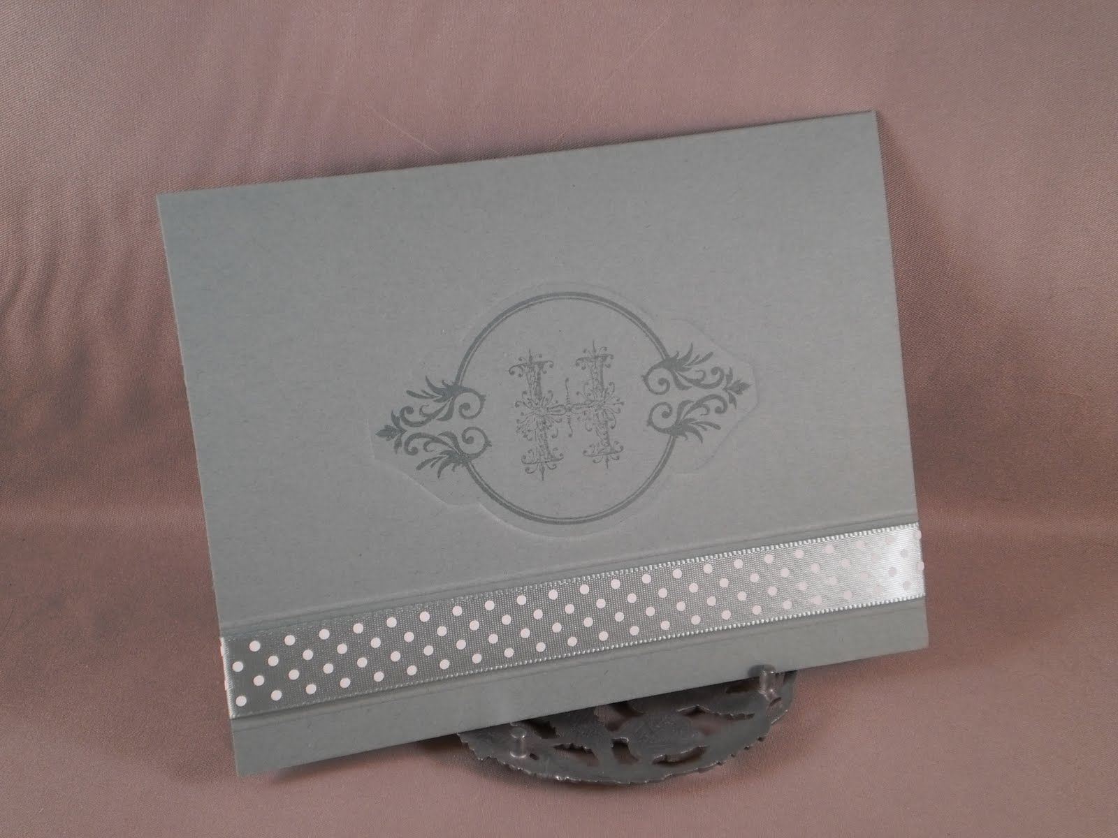 This week's Make it Monday challenge from Papertrey Ink was to use your dies to emboss. I all ready have a long list of dies I want to buy from them, but this made me want them even more. I don't have very many, so I used the only one I thought would work: Mat Stack 2. So I used it to make a personalized card. I used a coordinating image from the Mat Stack 2 stamp set and added an "H" from a monogram set I bought years ago on clearance at Michaels. I used ocean tides card stock and ribbon also from PTI. Using my scor-pal I scored lines above and below the ribbon.