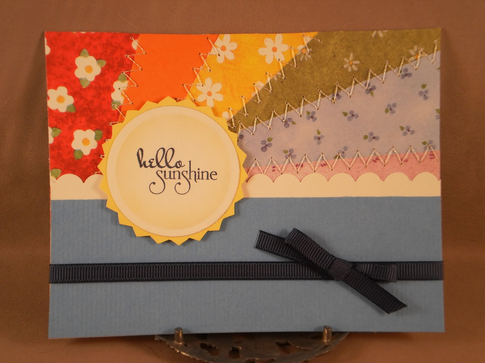 Doesn't this picture make you feel like spring? It is the inspiration photo for this week's timeless tuesday challenge (from Flourishes). For my card, I took inspiration from the circles (used the circles impressabilities plate from spellbinders), the stitching on the quilt (pierced around my sentiment banner) and the colors yellow, green and blue which are also the colors for Flourishes Spring Has Sprung challenge (grass green, robin's egg blue and daffadil yellow). I am also using the walzingmouse sketch challenge #42 and the Our Daily Bread Designs challenge to use no ribbon.