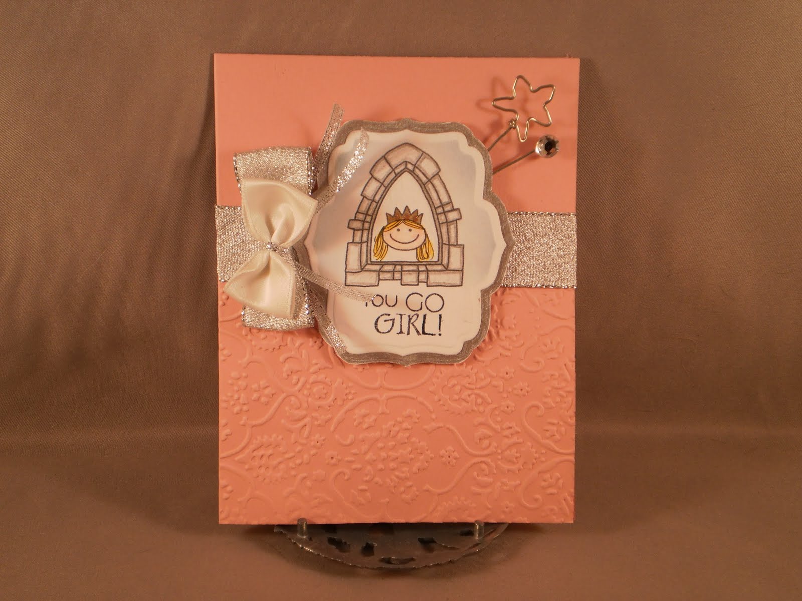 I can't decide if this should be a birthday card for a little princess or an encouragement card for a girlfriend princess. It could be either! It uses the Waltzingmouse sketch challenge for this week. They have recently changed their rules so you have to use a Waltzingmouse image in order to enter. I so need to win so I can get an actual set! I only have a digital set that was part of a package to raise money for a young woman who is battling cancer. You can read more here. This image is actually a prince, but I wanted a princess, so I drew in hair with a fine-tipped pen. I colored the image with colored pencils except the crown on which I used a gold pen. In the close up picture you can see I added some sparkly red jewels with a red marker and a glitter pen. I used a cuttlebug embossing folder on the bottom of the card. I created my own "stick pins" out of 20g wire; one is a star and the second is a spiral with a rhinestone glued on top. Was kind of going for a diadem look.
