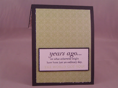 Hi, all! If you read my last post, you may think you are seeing the same card again, but it's different I promis. : ) I did use most of the same elements though, 'cause I thought they looked good together and gave kind of an edgy, hip vibe. This card is for my brother-in-law who lives in New York City (and thus is edgy and hip), and who also turned thirty today. Seems to be kind of a big milestone around here, so I wanted to make something really celebrating it. The sketch is from Skipping Stones Designs; I really loved the idea of bracketed numbers. The numbers were die cut using PTI's by the numbers dies and the brackets are from spellbinders' floral doily motifs which I just bought Thursday. I think I'm going to love it! The sentiment is also from PTI "Big Birthday Wishes" and the little flourishes inside the card are from their "Mat Stack 2" set.