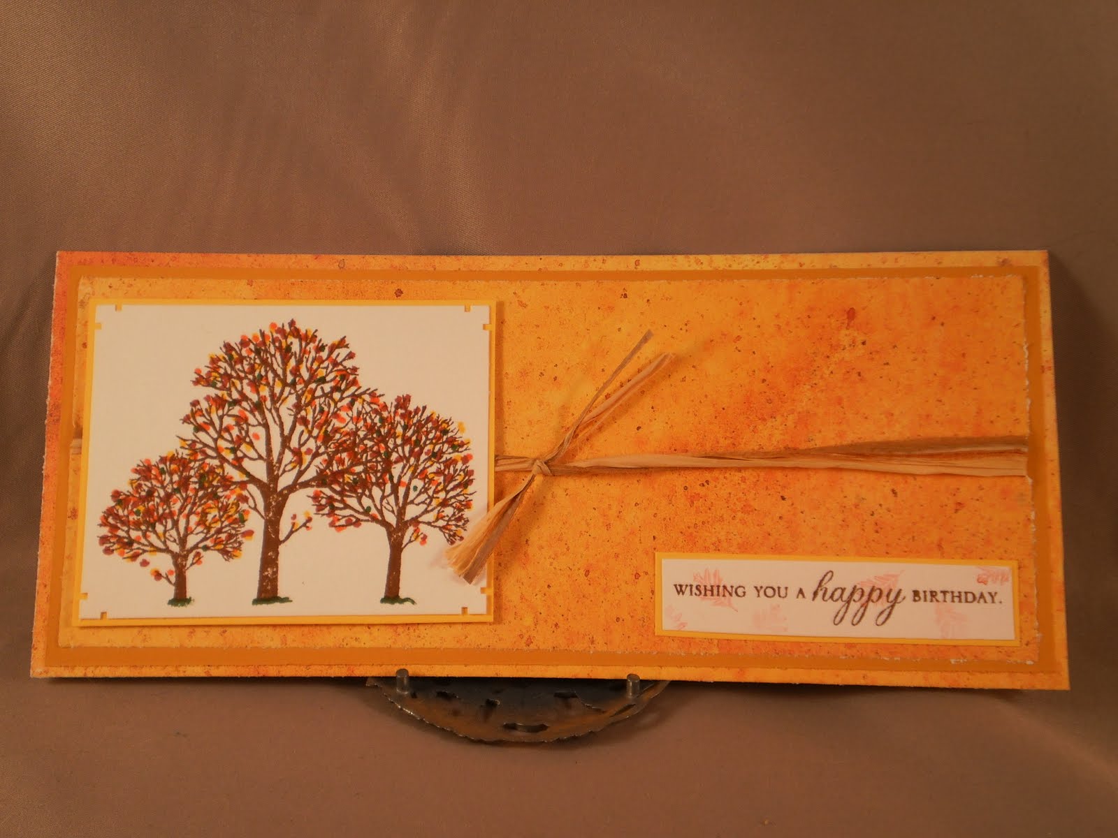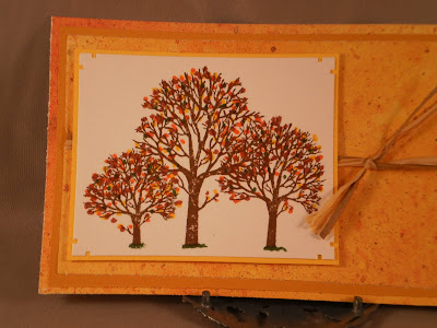 September is a very full month around here, there are several birthdays and anniversaries as you will see in following posts. This card is for my brother-in-law. The sketch and the challenge to use yellow (mine is really yellow with a strong orange tint, but it is yellow) is from The Pixie Cottage #86 challenge. This week's challenge from The Paper Variety is to use stamps--digital, rubber, clear, whatever. The papers are all DCWV, the tree image is from Papertrey Ink's "Through the Trees" set. The trees are actually bare, but I wanted the fall look, so I tapped in leaves with red, orange, yellow, and green markers. The sentiment is from the same set and the little leaf overstamping the sentiment is from PTI's "Places Please". And the raffia: rescued from the trash for the "sometime I might need it" moment. It was the perfect finishing touch.
