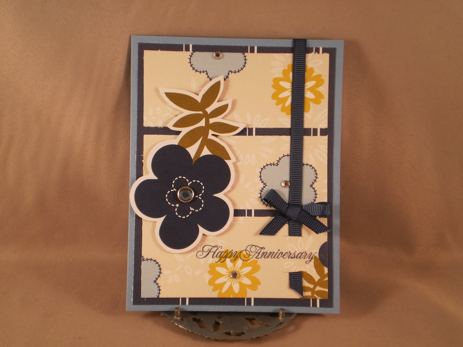So, many happy occasions this month. This week, it is my in-laws' anniversary. The sketch for this card is Skipping Stones Design #92, I also used the Delightful Challenge to "bling it up!" and the Clearly Inspired Challenge #35 to use patterned paper. The Paper Variety is celebrating their one year anniversary this week. To celebrate they are hosting lots of challenge and giving plenty of opportunities to win great prizes; today's challene is to use your favorite embellishment. Mine is definitely ribbon! The blue cardstock, ribbon and the jeweled brad (center of the large flower) are from SU! the sentiment is from Damask Designs by PTI, and all the paper and the large flower (which is a sticker) are from a kit I bought on clearance years ago. I think it is from Colorblok. I'm just starting to discover what a great kit it is.