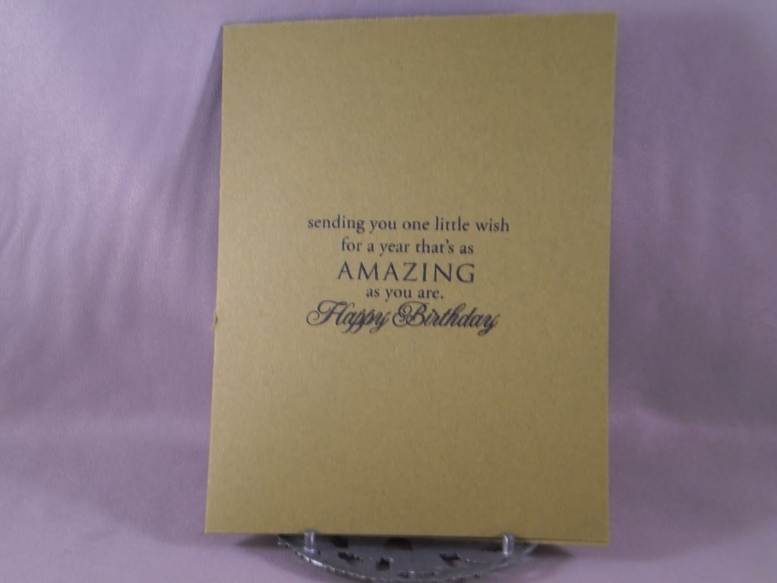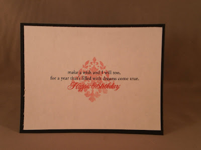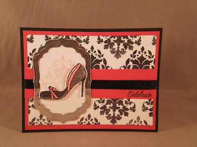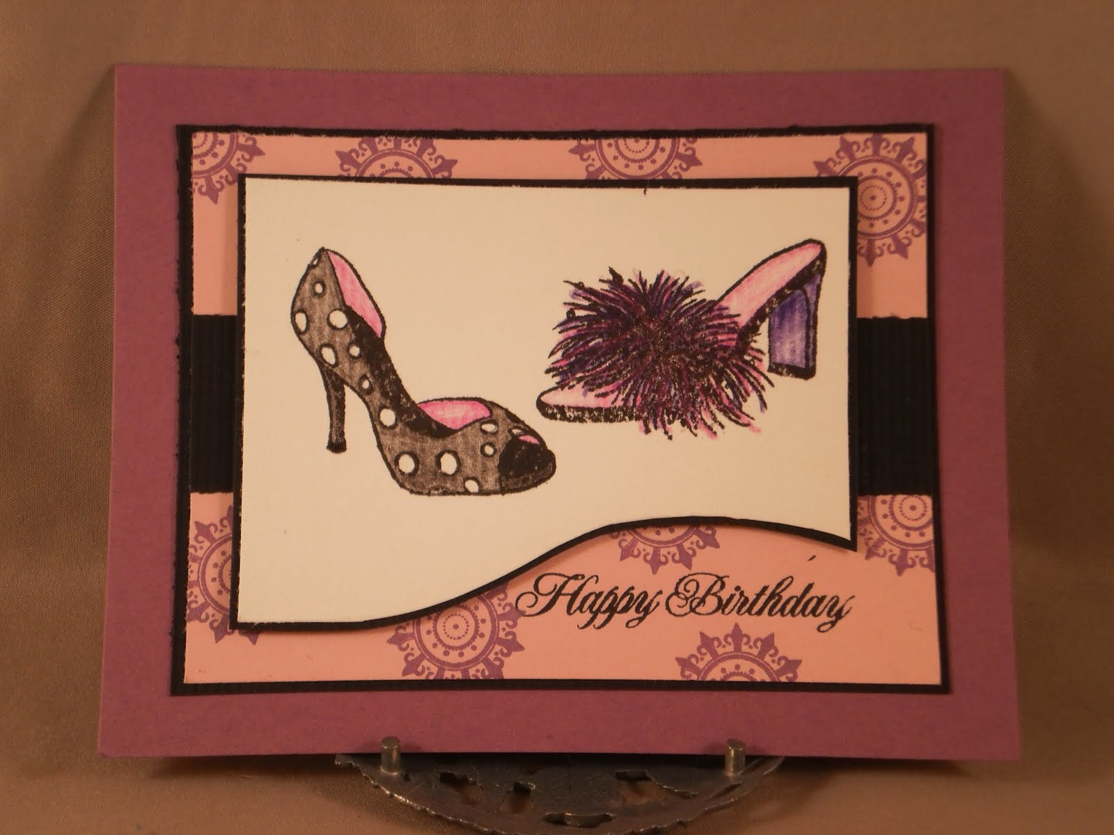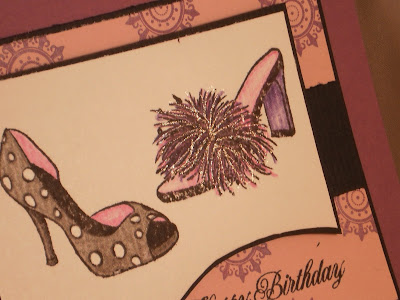 I LOVE shoes!!! Anyone with me? Well, luckily, my mother-in-law shares my passion, so these images from Skipping Stones Designs are perfect for a birthday card for her. And since yesterday was World Card Making Day and Skipping Stones was sponsoring a challenge to create a card using any of their stamps, they were also perfect for that. So, I stamped them and colored them with colored pencils and added some glitter pen to the feather trim which you can see better in the second picture. The cs is from Papertrey ink (can't remember what colors since I got them in a sample pack), as is the medallion stamp (Mehndi Medallion), and the sentiment (Damask Designs). The sketch is from Pixie Cottage with the optional challenge of "pop it up!" which I have done by popping up the focal image with foam dots.