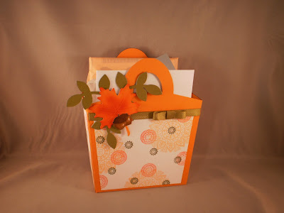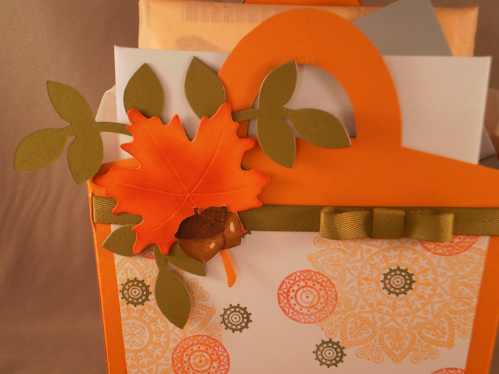 Isn't this picture gorgeous!? I love the decorations that come along with fall. This is the inspiration photo for Flourishes Timeless Tuesday #138 challenge. I opted to go with the fall theme and along with that the colors of fall. My project also fits the Pixie Cottage #90 challenge with the theme of Fall Fun, and the Delightful Sketches challenge to "make it dimensional".The little bag is made from the "Tricky Tote" template from My Time Made Easy. It does take a couple sheets of paper (6 or so with the decorative layer) but was really easy to put together and is just really adorable. I loved it so much, I used it in another project which you can see in my next post. For the embellishment I cut two leaf branches and cut them apart, topped them with a die cut maple leaf that I scored the veins into and inked up the center and edges with red ink to add a more realistic look, then I stamped, colored and cut out the two acorns and layered the whole bunch together.