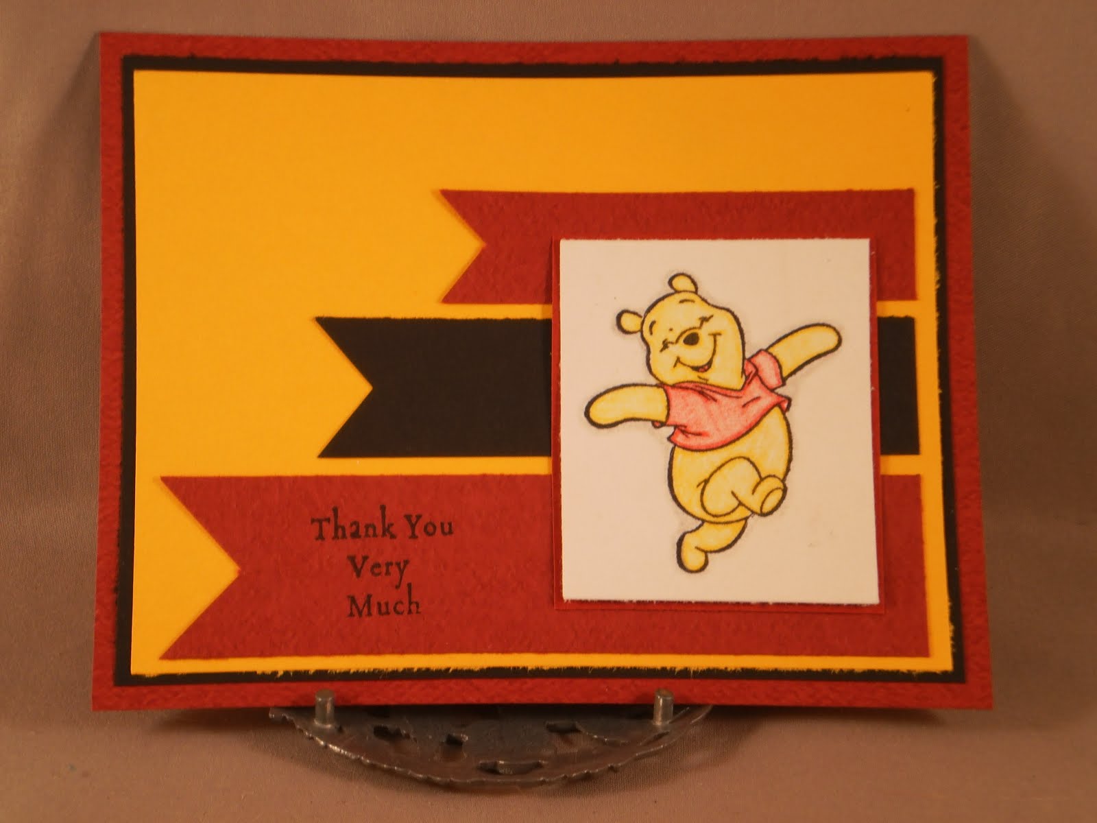 As yesterday was World Card Making Day, Flourishes was sponsoring a challenge to use the colors of your favorite animated character to inspire your card. Is there anybody cuter than Winnie the Pooh? This image is just so joyful and carefree. I thought it was perfect for a thank you for a gift I was really excited about. Both the image and the sentiment stamp are random singles that I have had forever. The sketch is from this week's Clearly Inspired Challenge #37 (Clear Dollar Stamps). I hope this little guy makes you happy.