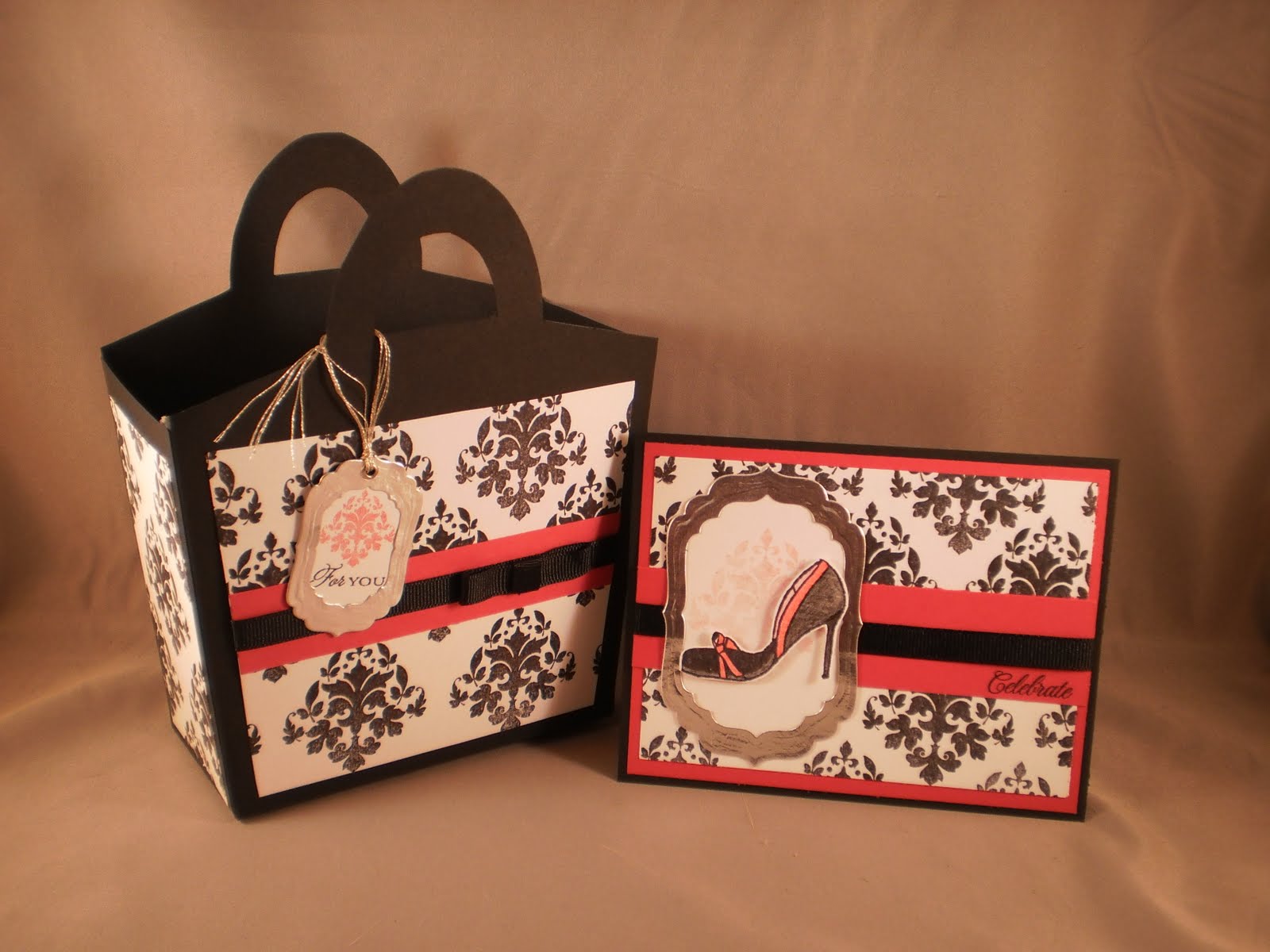 For this project, I used the Skipping Stones Design #96 sketch and the Flourishes Release Week challenge "Heavy Metal": use metal on your project. This gift set is for my sister-in-law who is very stylish. When I think of stylish and elegant, I think of my absolute favorite stamp set: Damask Designs by PTI. I used two of the damask images "Celebrate" and the "Happy Birthday" on the inside of the card. The rest of the sentiment inside is from Big Birthday Wishes by PTI. These gorgeous shoes from Skipping Stones Design "Sassy Shoes" are also full of style. The "Tricky Tote" is an awesome template from My Time Made Easy and is such a great gift presentation. I used the labels 4 dies from spellbinders with aluminum tape to creat my metal tags.