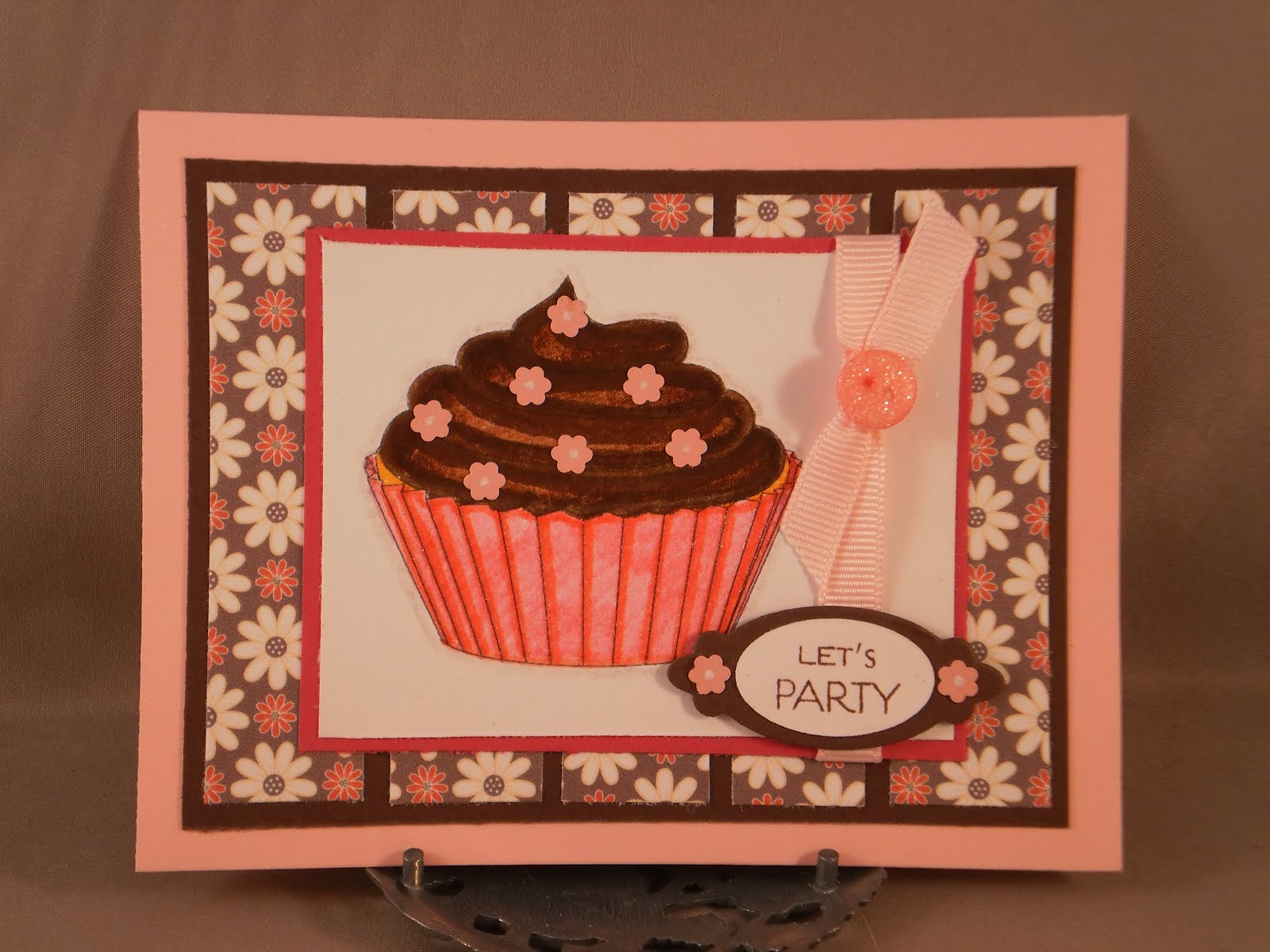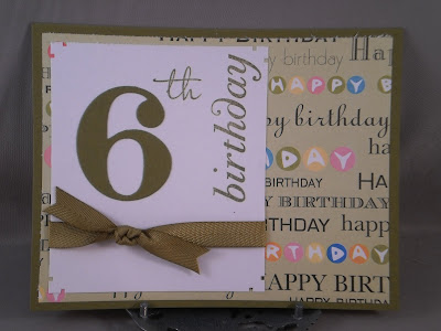Another birthday invite for my 6 year-old's birthday next month. The sketch is Pixie Cottage #109 and I also used there optional theme of Buttons & Bows. I also used the challenge from Delightful Sketches to use patterned paper. Mine is all from an old SU! pack (I think it had to do with baby girls--all pink/yellow). The cake stamp is actually a wedding cake from a wedding set I bought at Michael's a long time ago. The sentiment and the die are from Verve (the set is Birthday Phrases).