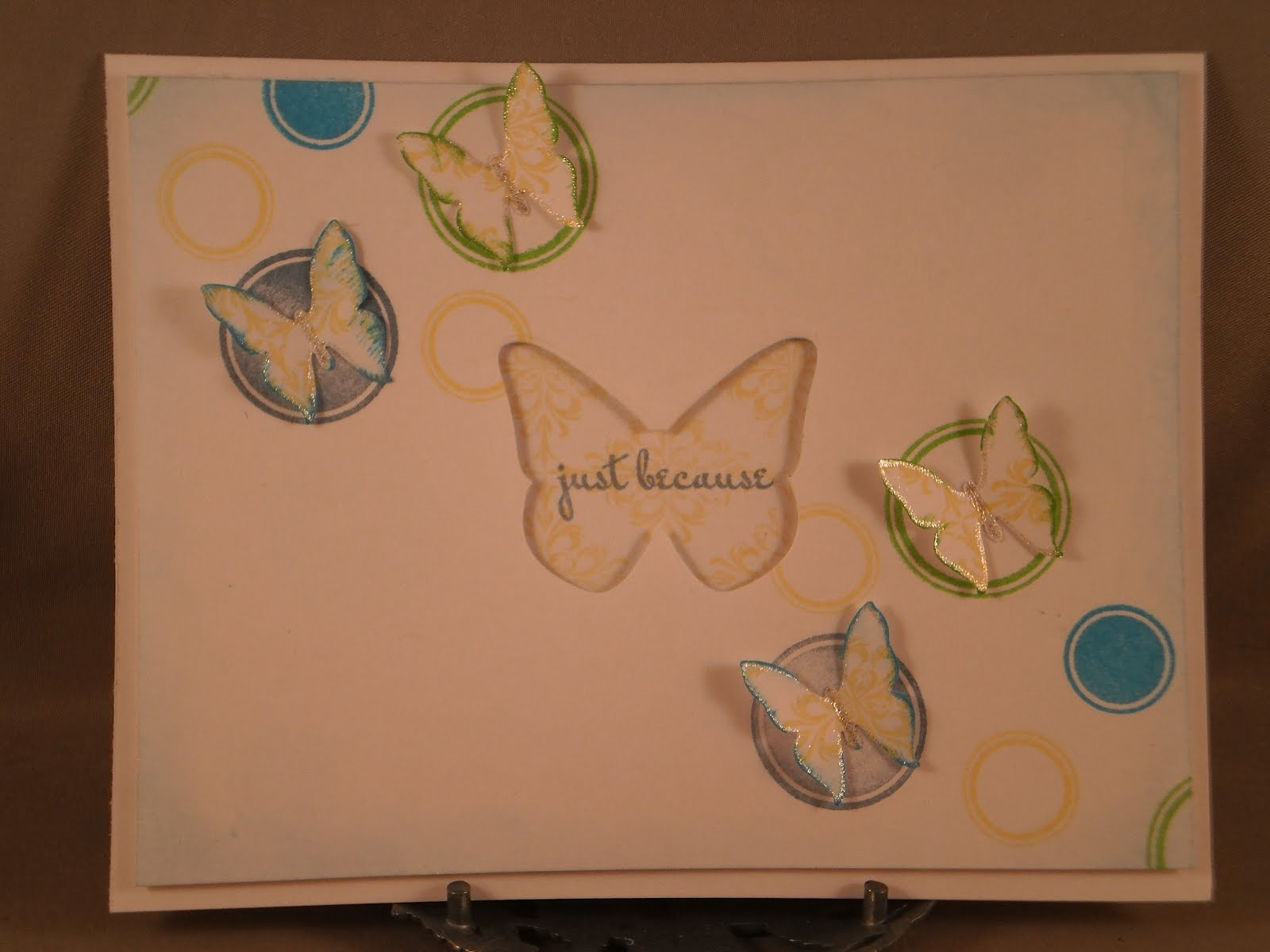 All products are Papertrey Ink (except the French Script I stamped on the leaves and the butterfly): Mat Stack 2 die and stamp set, leaf die, butterfly die and the sentiment from "Damask Designs"