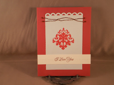 Because I love Papertrey Ink's products and so want to win today's challenge (and who doesn't?), I made two cards (see my previous post for the other card). This card uses the sketch #2 from the sketch challenge which is part of PTI's 5th anniversary festivites. Both stamps are from Damask Designs by PTI and the border punch is fiskars. A little hand stitching and a row of pierced holes on either side of the sentiment strip finish it off.Fancy love