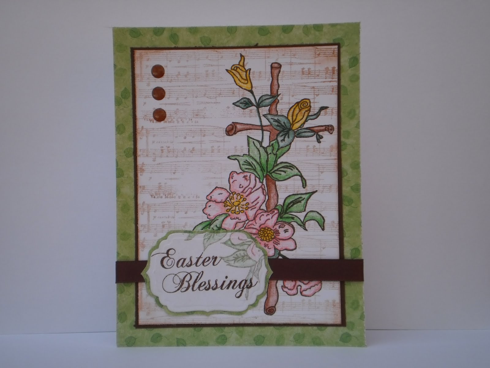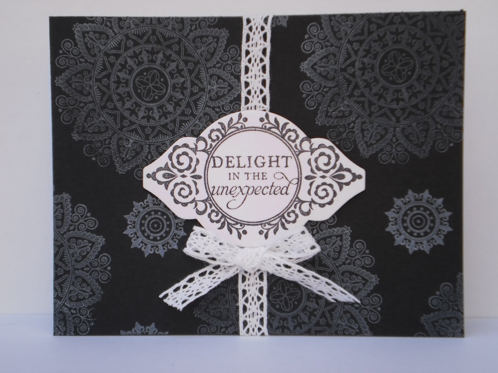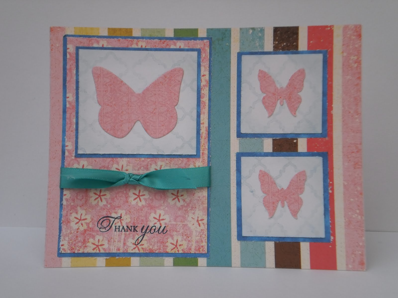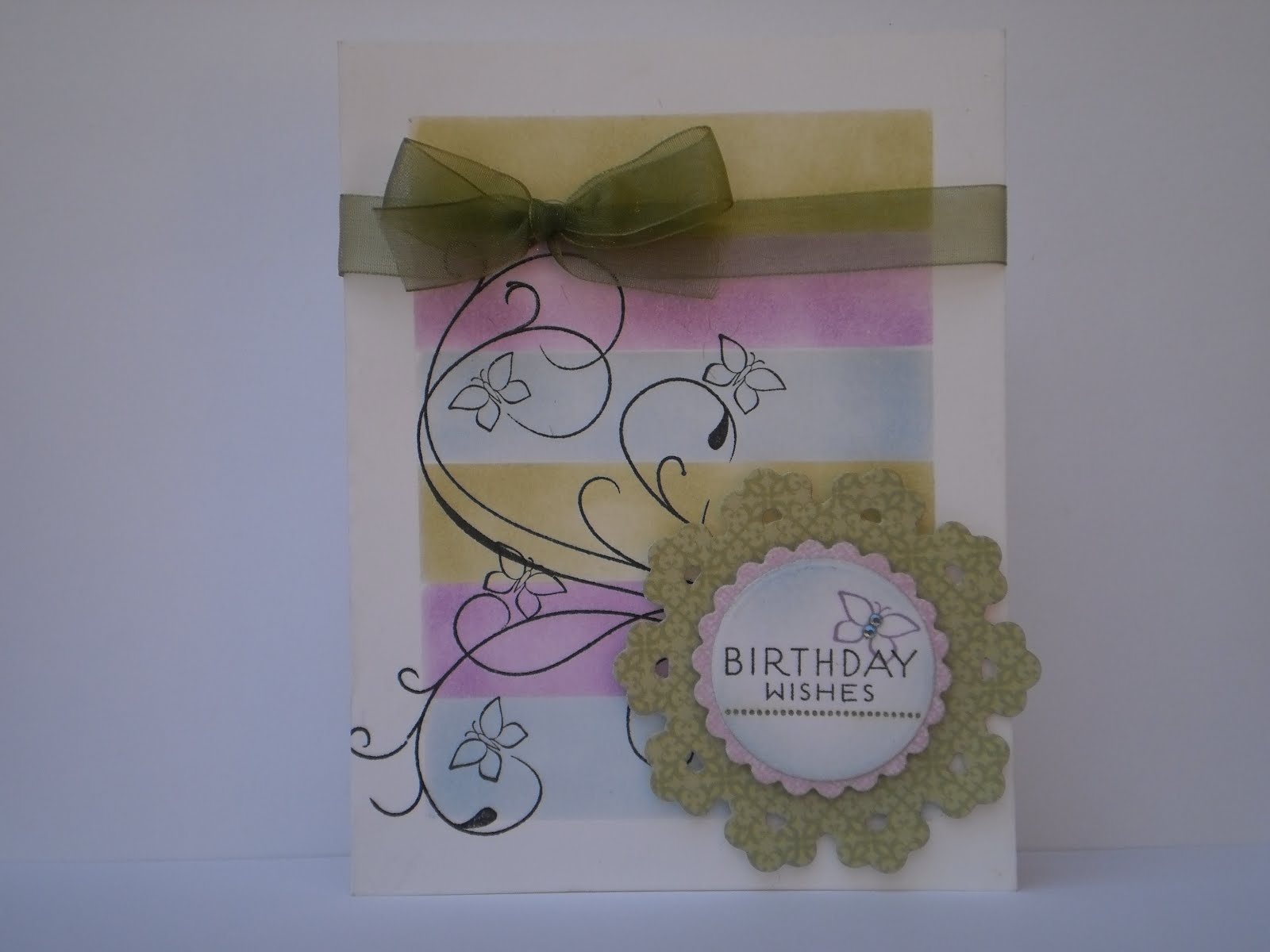 Our Daily Bread Designs #104 Spring Word challenge (use elements that begin with at least three letters of the word "Spring"); I used "S"-sponging and stamps, "P"-pastel colors, "R"-ribbon, "I"-ink, "N"-nestabilities dies (classic scalloped circle, large and standard circles, large and floral doily motifs), "G"-gems (little blue rhinestones on the main butterfly). I blocked off the center portion and divided it into sections with post-it notes and sponged the different colored strips. In the process, I learned that post-it notes do NOT like to stick to ink! Then I added the flourish from Clear Dollar Stamps' "Elegant Flourishes" set and the butterflies from SU!'s "Sweet Summer" set (a sale-a-bration set) in black ink. Part of the inspiration for this card was the three die cuts I used. They were left overs from another project and fit the color scheme perfectly so I had to use them. The sentiment is from Verve's "Birthday Phrases" and the little dotted line stamped in green underneath is from the CDS flourish set. A little purple butterfly and blue rhinestones finished it off.