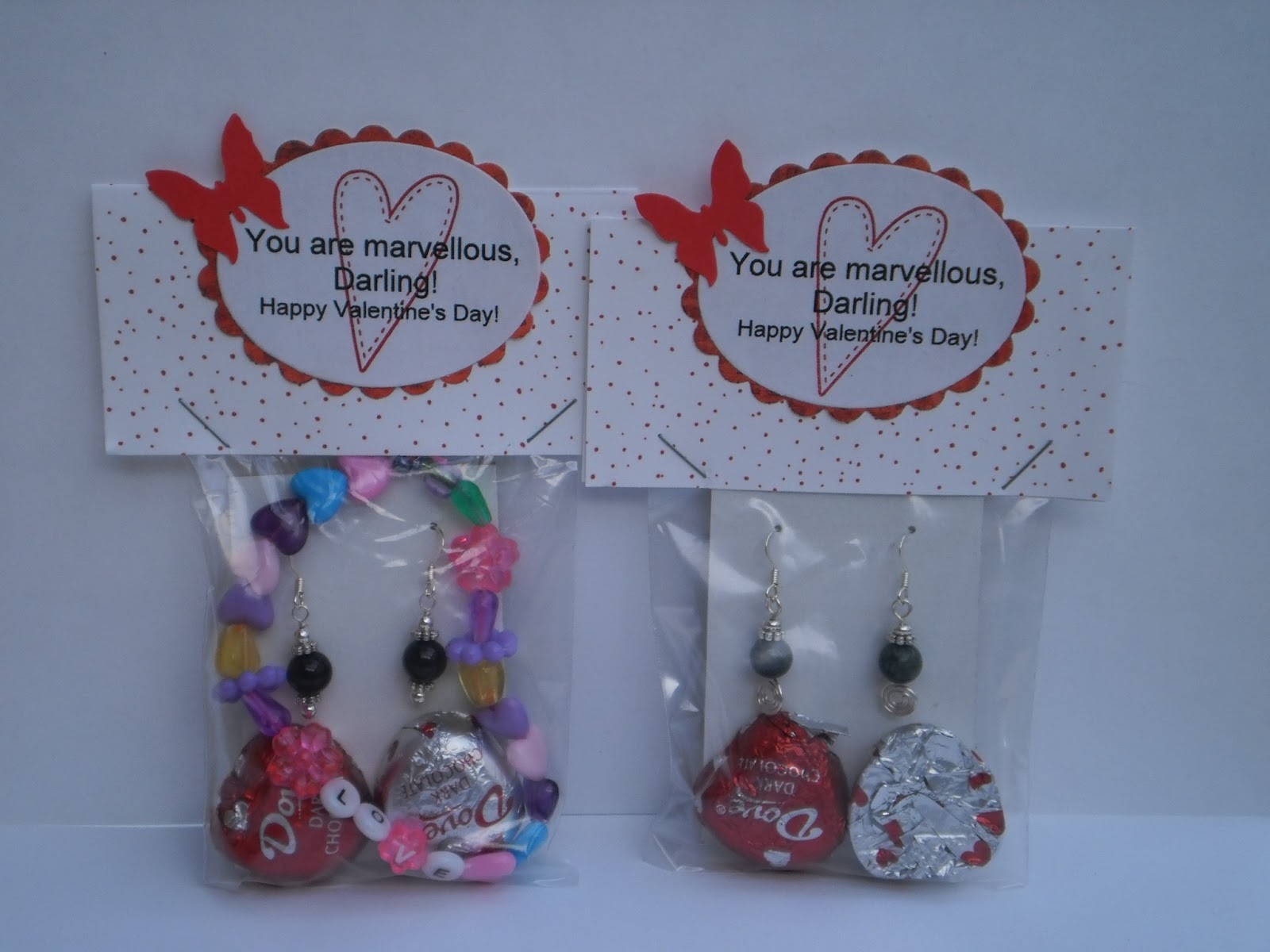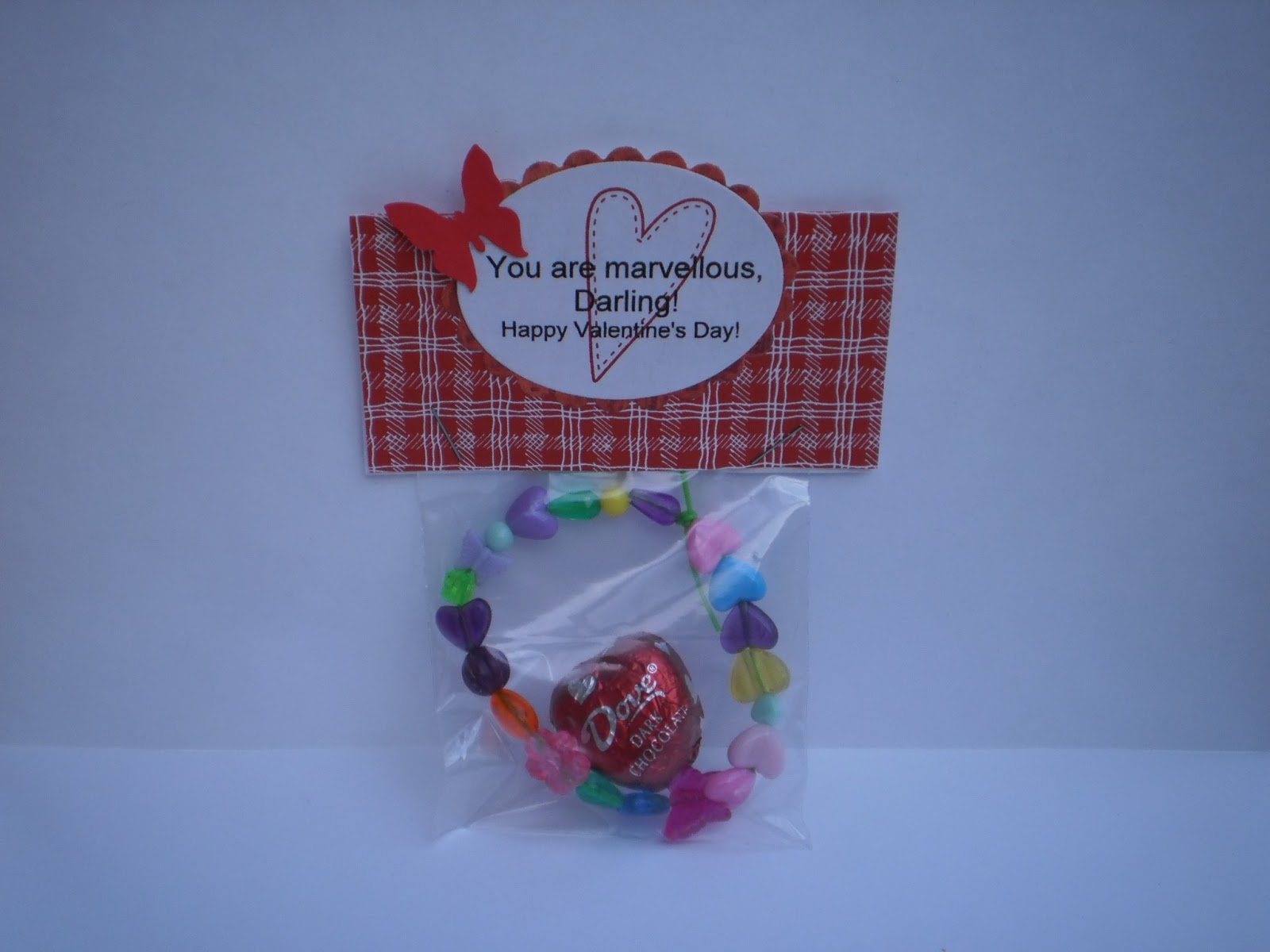 For the little girls in storyhour, I made two different Valentines. We have several that are right around 1 year old and I didn't think the mothers would appreciate candy for them, so I put in little plastic butterfly bracelets. And for the older girls, little candy bracelets and a chocolate. Let me tell you that they all were a big hit.