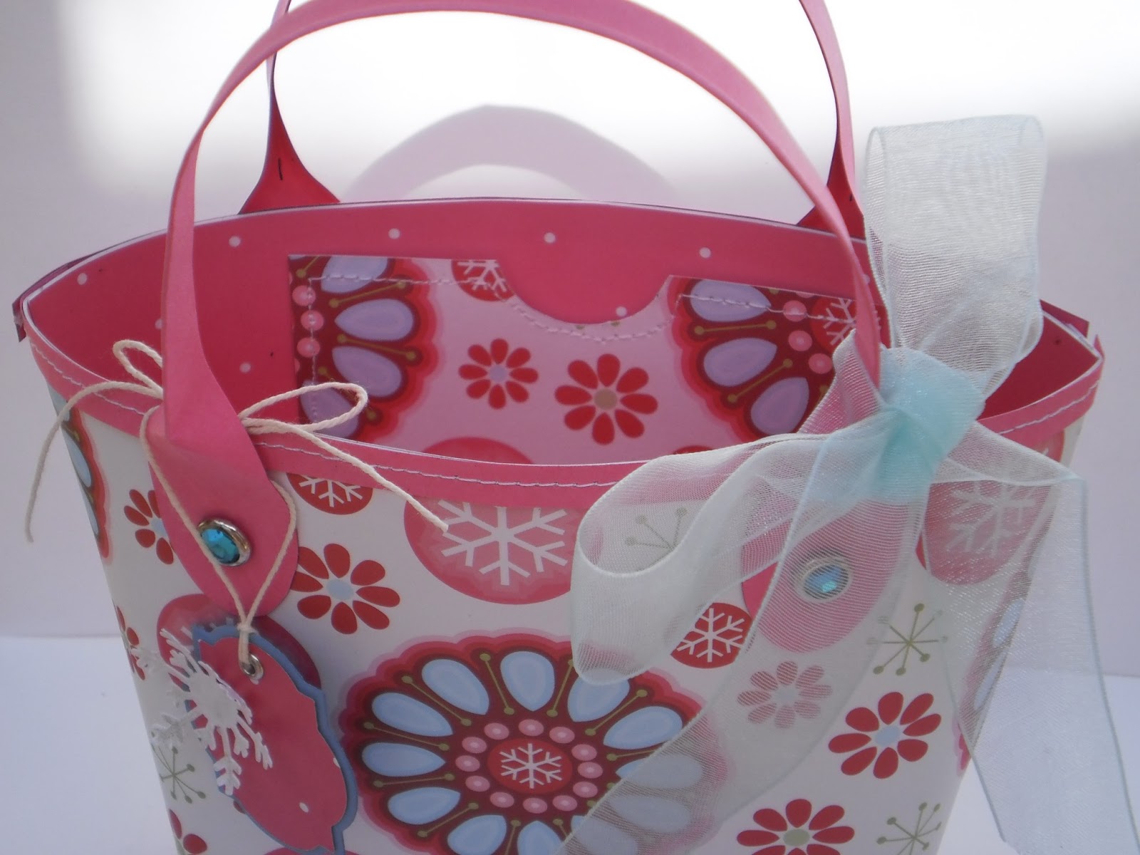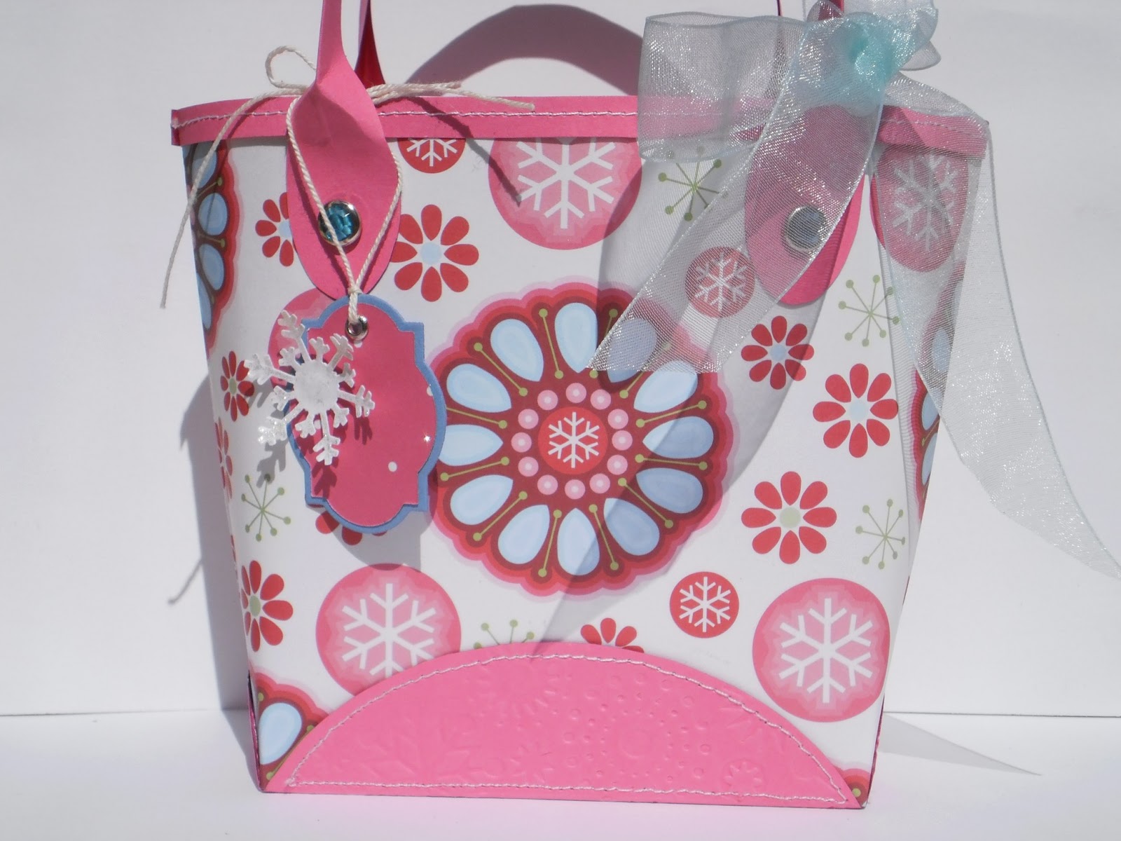 It is small (5 1/4"x4 1/2" and about 1 1/2" deep on at the base), but it would be perfect for a small gift (jewelry anyone?) and the optional little pocket would also be perfect for holding a gift card. I tried to go designer with my bag; even pulled out my sewing machine to stitch around the pink base and the top edge. It is the perfect finishing touch. I also sewed around the pocket but don't look too closely because it was really hard to stitch around the half circle. I didn't add a whole lot of detail since the paper is so stunning. Just a little tag that could say "To:/From:" and maybe have the recipient's initial embossed on the front. I didn't do that since I don't know who I will give it to yet, though I do have a few ideas. I also added a ribbon "scarf" to the handle, 'cause that's the thing to do, ya' know. Oh, and I almost forgot: I embossed the pink panel at the bottom with a snowflake embossing folder. It doesn't show up so well in the pictures, but it's really cool in real life.