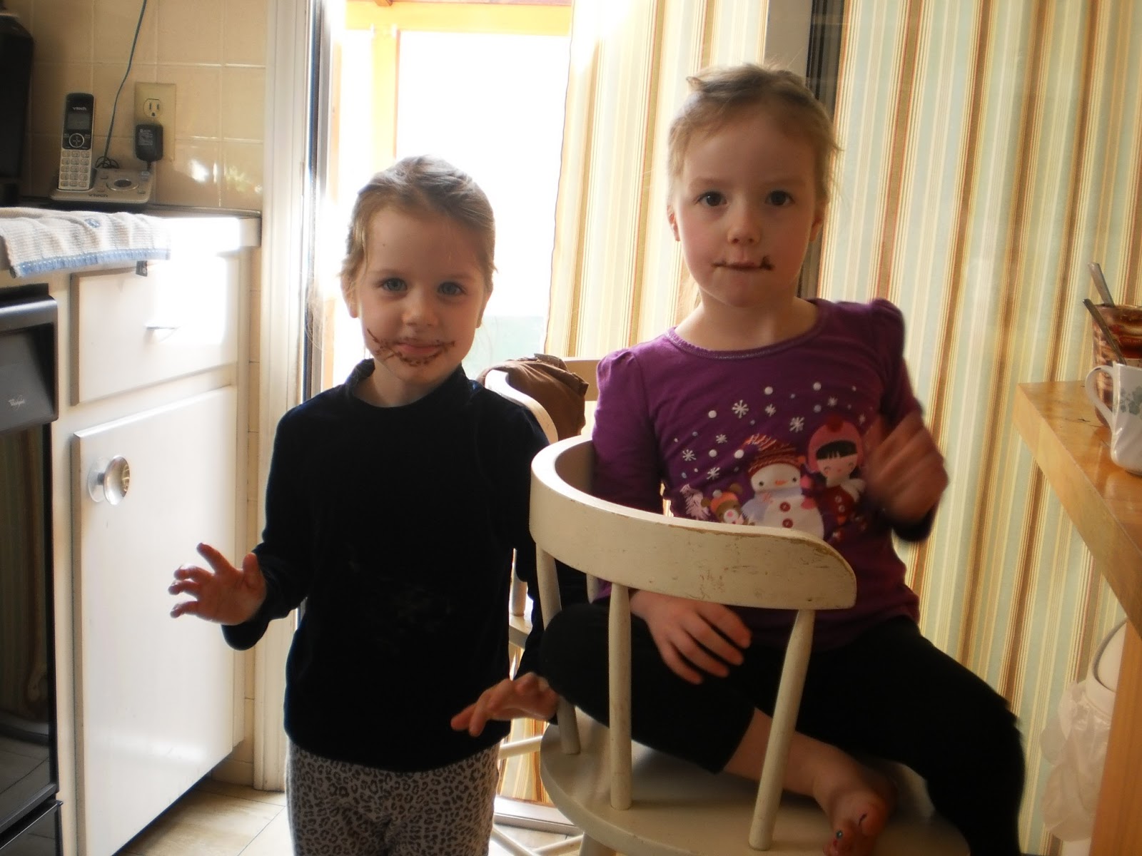 Just a fun little picture of what happens when you let two four year olds loose with a spoon and a bowl of melted chocolate. Check out those faces!