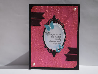 Now, being American (though maybe some of you out there are) I am not familiar with this candy, but for whatever reason, the pink and black really stood out to me in that maze of color. So, that's what I went with, adding a little bit of blue for contrast. And my use of music is subtle, but there in the sentiment. I had a totally different card in mind when I started out, but somehow it turned into this.