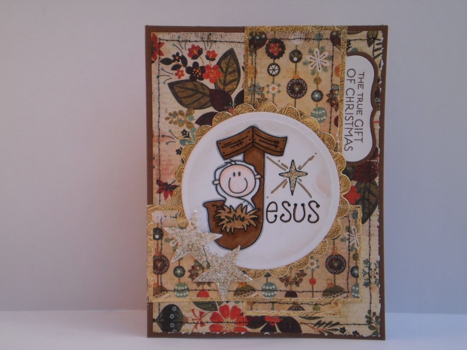 Brown and gold are definitely not a traditional Christmas color scheme and not a color scheme I would use at all normally. But when I got this adorable image to play with, it just sort of fell together. Because without adding a metallic, it was going to be hard to get sparkle and shine to pair with a manger image. There wasn't a whole lot of sparkle and shine going on there!