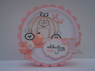 This is a sweet birthday card I made for a sweet friend. If I had a stamp that said "Queen for a Day" I totally would have used it since it would go perfectly with this pumpkin carriage. But I think the sentiment "celebrating you" works too. I forgot to take a picture of the inside, but the sentiment reads "bring on the HAPPY".