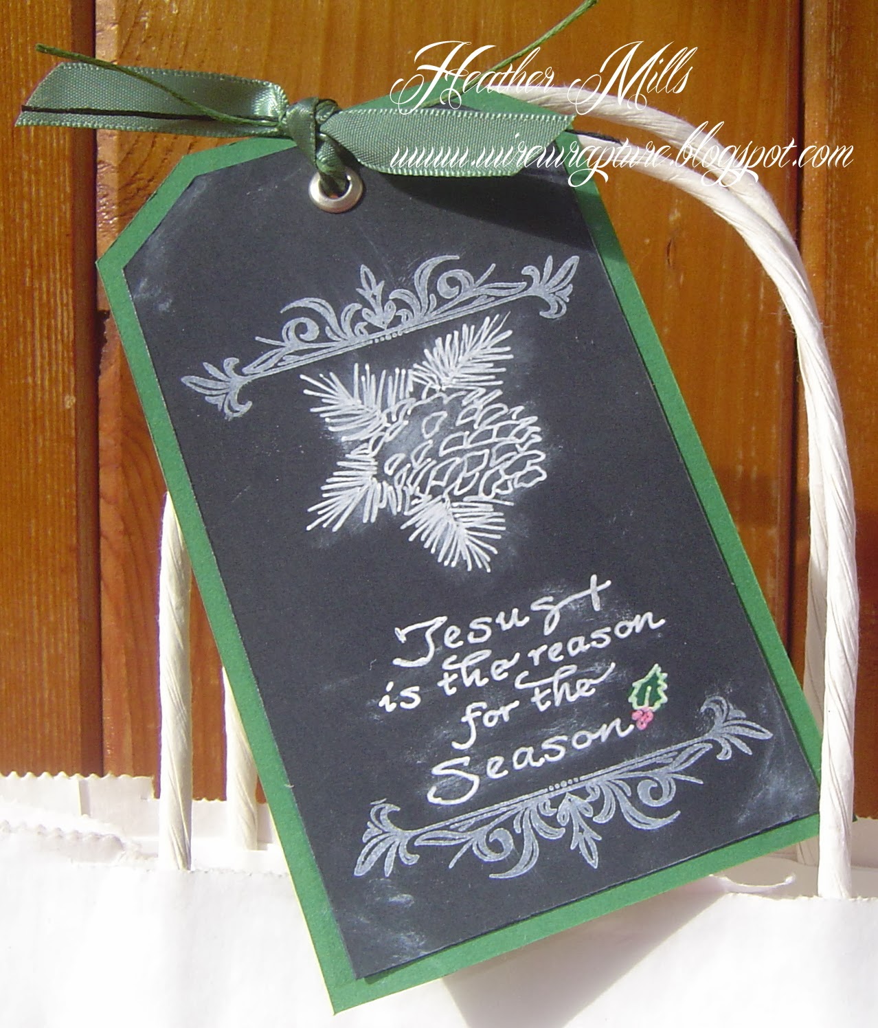 On both the card and the gift bag, I sponged on some snow hills around the church and added some silver stickles for snow sparkle, sponged in some sky and added a soft glow to the windows with a colored pencil. Also on both, I colored the pinecone, added a little bit of sparkle with a glitter pen and fussy cut it out and popped it up on pop dots. I tied the card and tag together, by adding this "faux" chalkboard sentiment "Jesus" which is continued on the inside( I totally forgot to take a picture!) with "is the reason for the season".