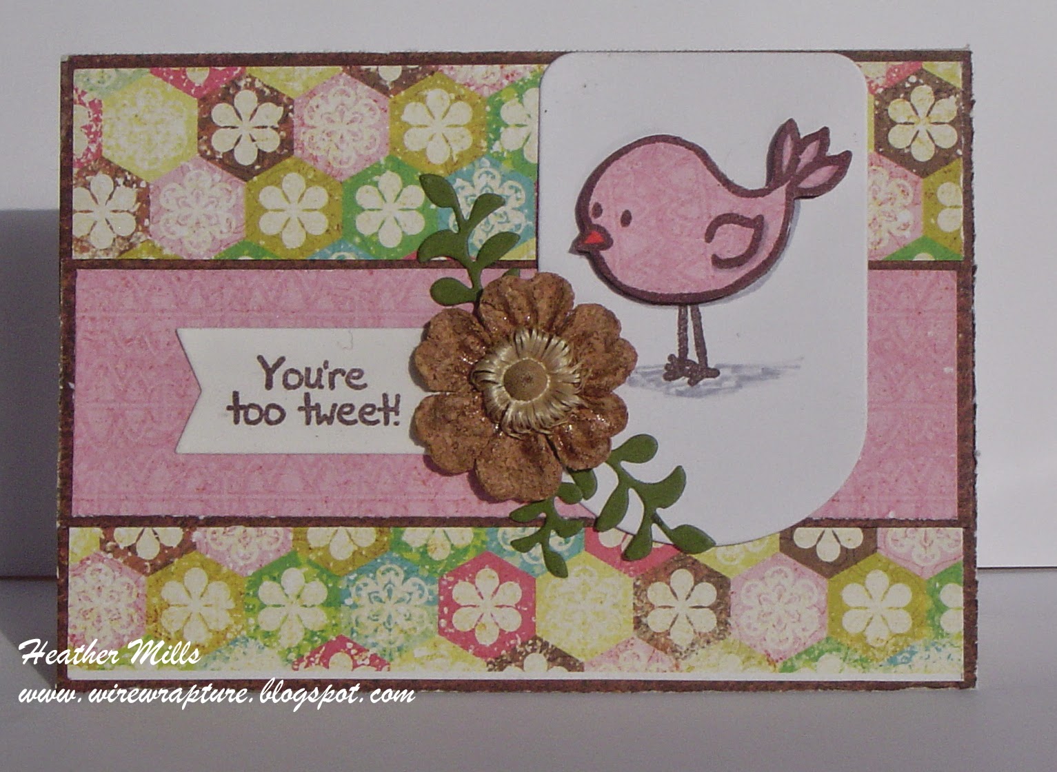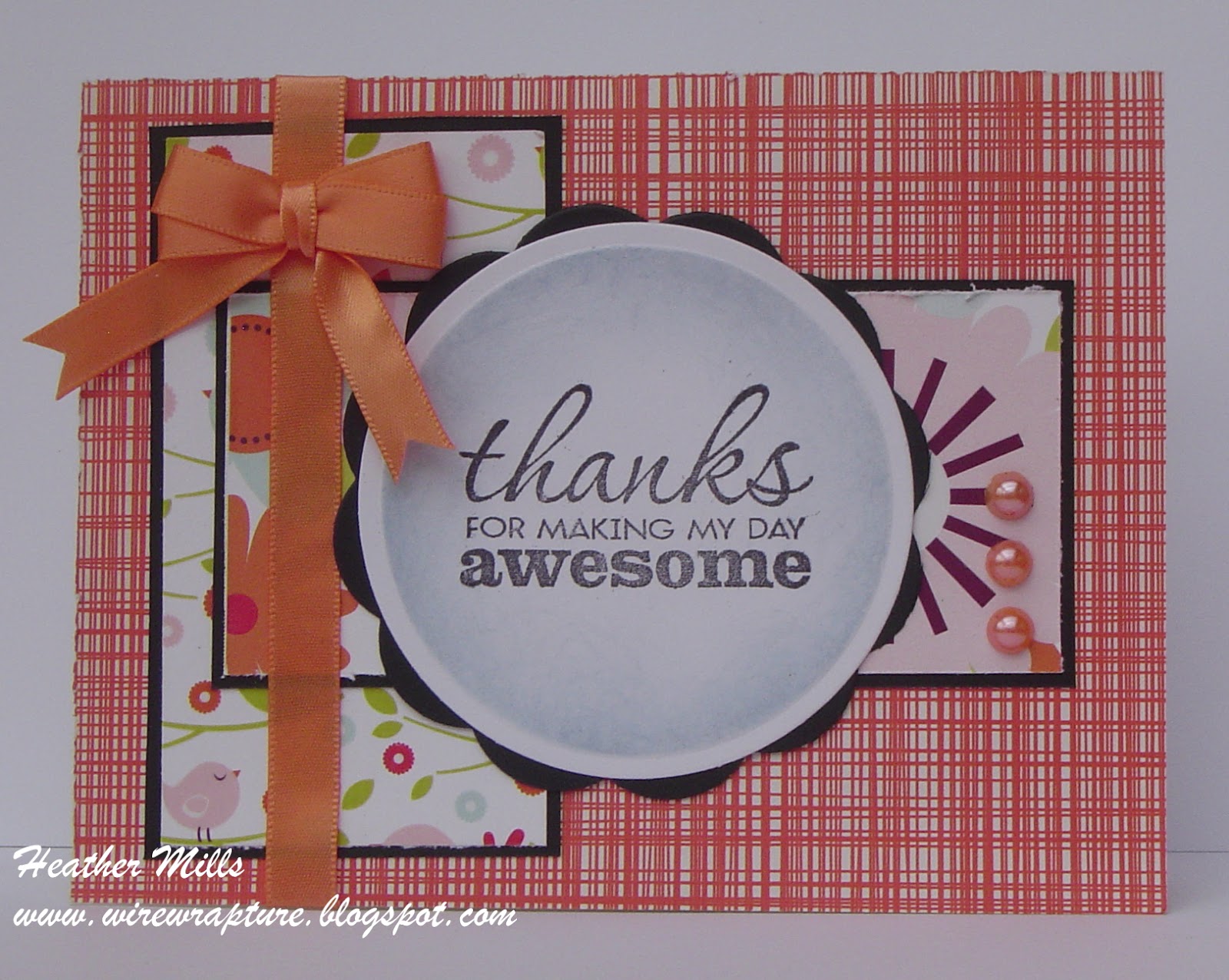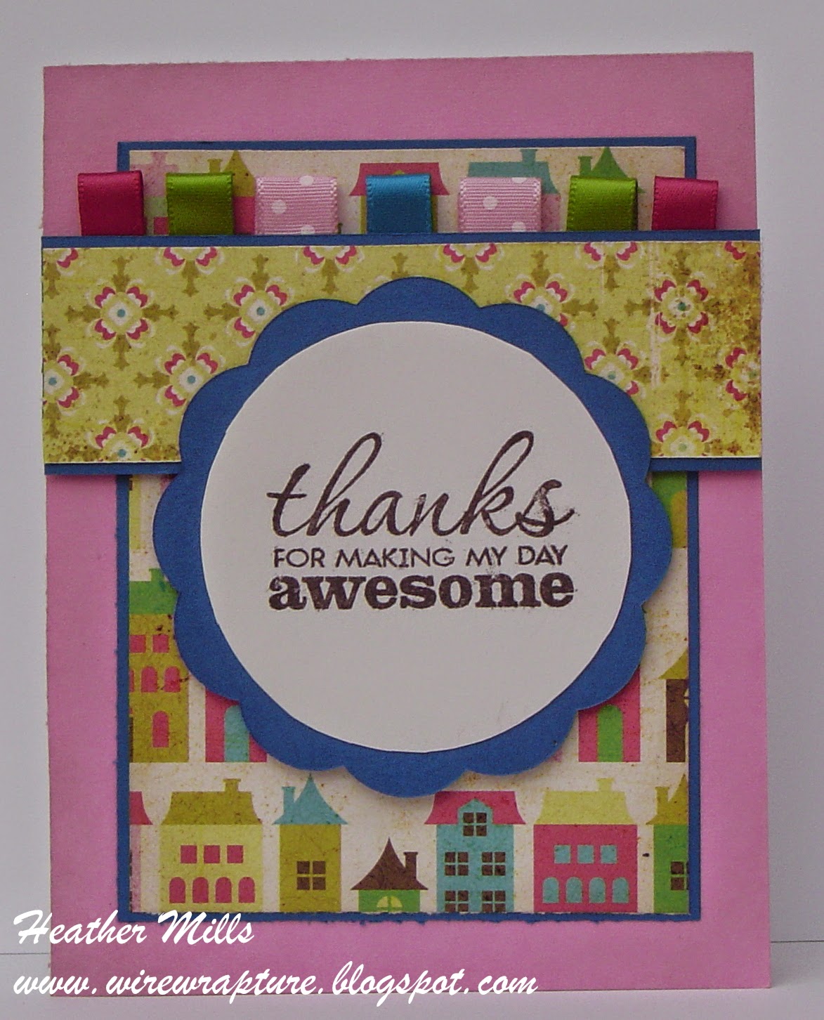 Here's another fun card using an item from my "bits and pieces" stash. This patterned oval has been in the stash for at least 2 years!! I just wasn't sure what to do with it, because the pattern was a little strong to stamp over. But then I started thinking about vellum and knew it would soften it up enough to allow the pattern to show, but not overwhelm the sentiment. Yeay! Another difficult piece used. And it is what inspired the color combo. It's a bit bright, but I think it's rather pretty.