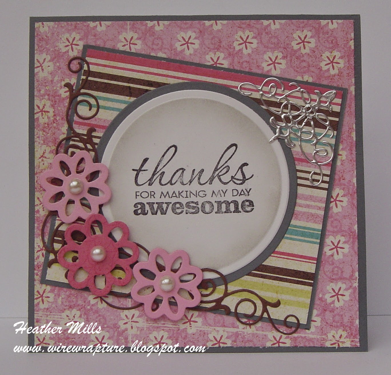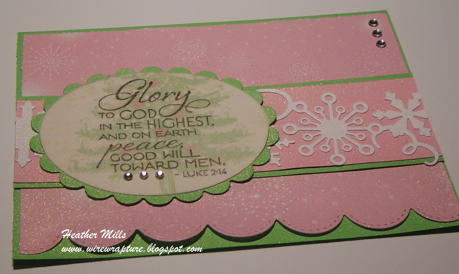 After adhering all the layers together, I spritzed the whole card with some Glimmer Mist. It's hard to see in the photo but it really adds such a nice subtle sparkle. And see that gorgeous diecut? A very lovely woman sent a whole bunch to me after I commented on some dies she had used on her card. Thanks, Gail!!