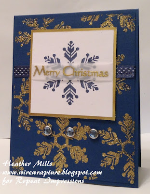 I started off by stamping the large snowflake image randomly over the card stock with embossing powder and then embossing it with the gold tinsel powder. I stamped the same snowflake with navy ink onto a square of white card stock and layered in on a shiny piece of gold paper. I finished everything off with the sentiment embossed with regular gold powder on a strip of vellum so I could overlay it on the snowflake, a bit of stitched navy ribbon and three rhinestone brads.