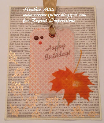 The inspiration photo is so beautiful; I love the softness of the leaves. They look almost translucent. I tried to capture that softness by using vellum for both my large leaf and the top layer of my tag. I stamped the leaf on vellum with an orange ink and then restamped on top with red ink sponged around the edges. Orange-y red leaves are my favorite! Using my mini MISTI makes it really easy to do this technique. I also used the MISTI to stamp the sentiment several times on the tag so it would be dark enough to stand out against the background of the patterned tag. I sponged some tea dye ink around the edges of the book print paper to add some dimension and I stamped the scattered leaves along the bottom using my copper Gilding Paste (which is quickly becoming one of my favorite products!). In the photo below you can see how shiny the leaves are. It looks like they are embossed without all the effort (and the buckling paper I always get with heat embossing)!!