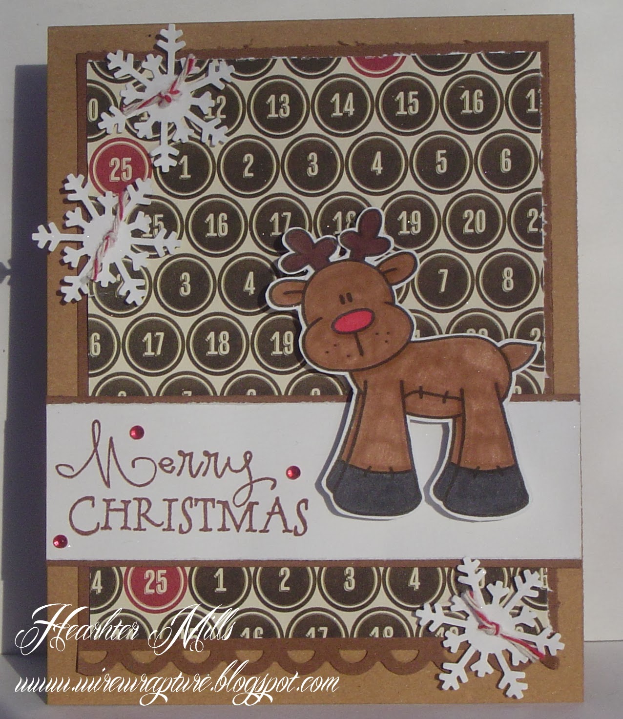 I'm slowly making my Christmas "thank you" cards. This is my most recent. I really need to get a move on as it is time to get them sent out. I'm very excited that I used TWO items from my scraps stash--the scalloped border and the ribbon. Yeay! But then I added one thing--an ampersand the got cut out with the letters. Its still a positive gain, though. I am going to try to use up more of those things in the near future. A little challenge for myself.