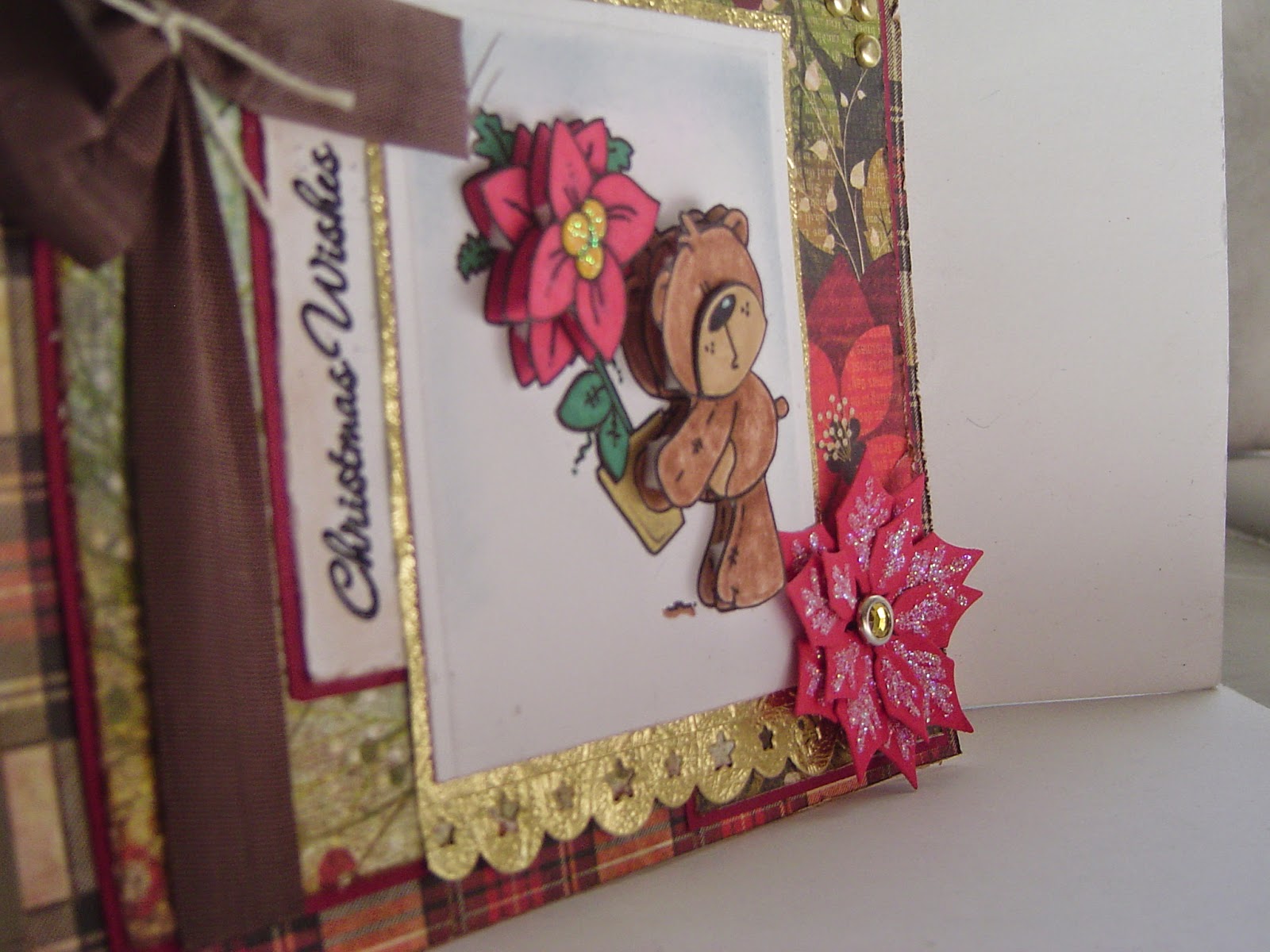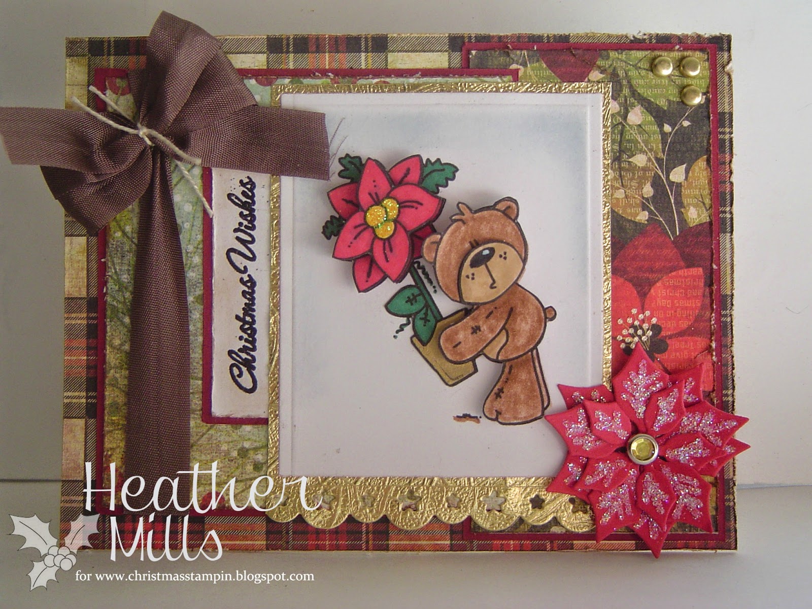 Happy April, everyone!  I can't believe it is hear already.  AND it's Friday so another challenge from Christmas Stampin' All Year Long has gone live.  The challenge is: use lots of layers.  Easy right?  The sponsor this week is Bugaboo Stamps and I got to use this adorable image "Poinsettia Bear".  Isn't he cute?