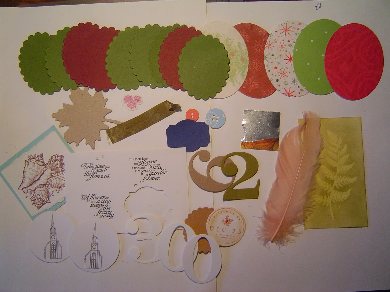 I just love this cute little snowman!  I used him and these glittery snowflakes to create a little wintery scene.  Fun!  The patterned oval was from my bits and pieces stash and as promised last month, here is a picture of the stash.  I'm going to try to remember to update it every month.